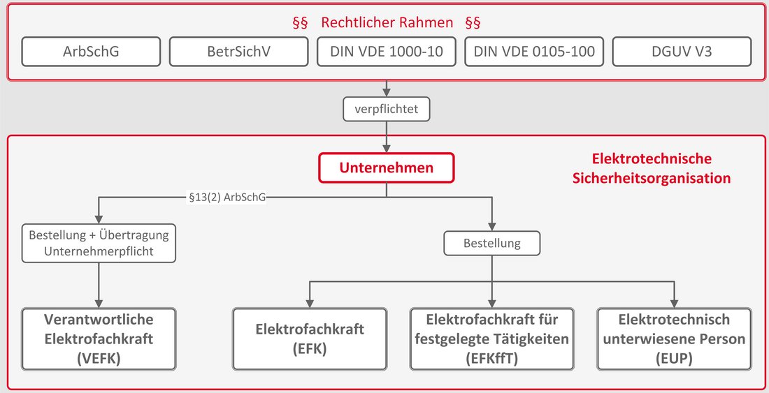 Das Arbeitsschutzgesetzes (ArbSchG) verpflichtet in Artikel 3 jeden Unternehmer/Arbeitgeber, die Gesundheit seiner Arbeitnehmer durch eine sichere organisatorische Umgebung und die Bereitstellung geeigneter Arbeits- und Betriebsmittel zu gewährleisten. Ferner schreibt es die Fachverantwortung für die Elektrosicherheit als Teil der unternehmerischen Gesamtverantwortung fest.